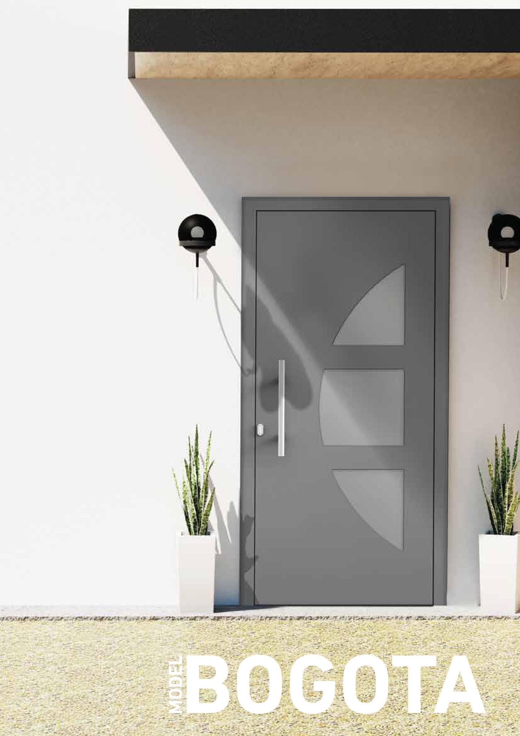 Die Tür Bogota überzeugt mit ihrem eleganten Farbton Heldgrau und einem stilvollen, modernen Aufbau. Oben befindet sich ein halbkreisförmiges Fenster in Milchglasoptik, unterteilt in drei harmonische Segmente, das für Lichtdurchflutung sorgt und gleichzeitig Privatsphäre wahrt. Abgerundet wird das Design durch einen kurzen Edelsteingriff, der einen edlen Akzent setzt und die Tür zu einem besonderen Blickfang macht.