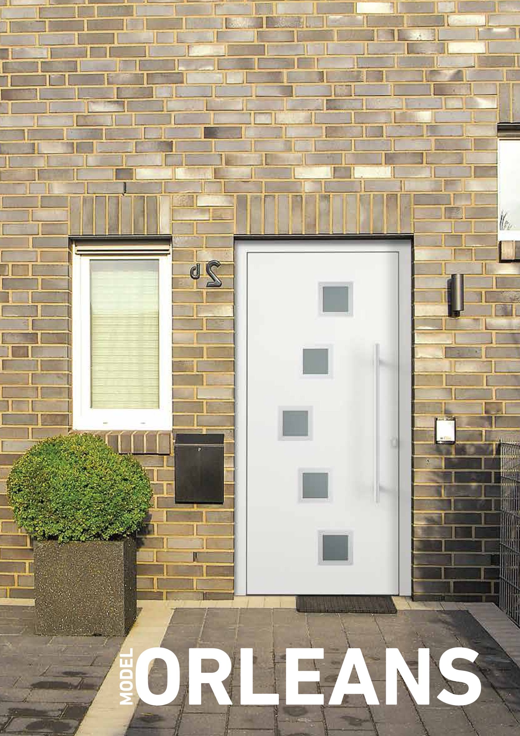 Auffällig sind die kleinen, quadratischen Fenster, die sich in einer leicht geschwungenen Schlangenlinie über die Tür ziehen – ein elegantes Detail, das Bewegung und Leichtigkeit vermittelt.